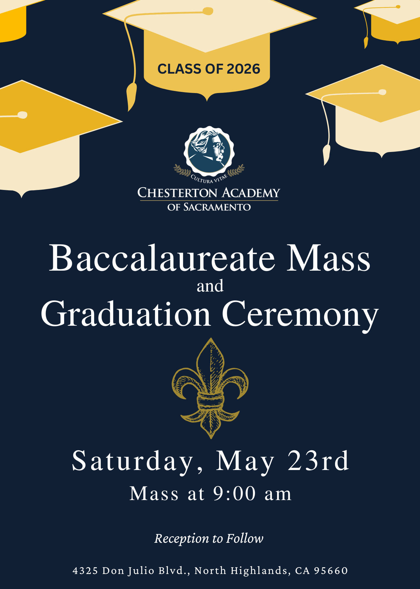 Baccalaureate Mass & Graduation Ceremony Saturday, May 23, 2026 9:00 AM 11:00 AM 09:00 11:00 Chesterton Academy of Sacramento 4325 Don Julio Blvd North Highlands United States (map) Google Calendar ICS
